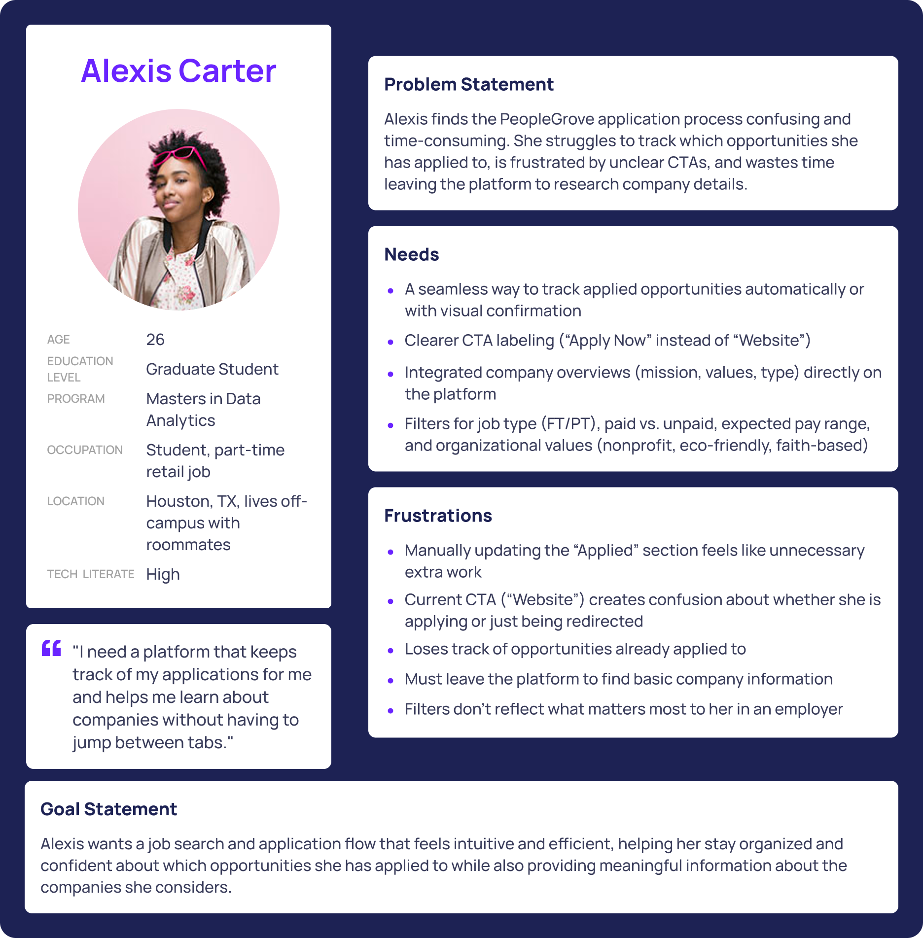 Alexis represents the common challenges students face when navigating PeopleGrove. She’s balancing graduate school and career preparation, but the opportunity process feels disjointed.