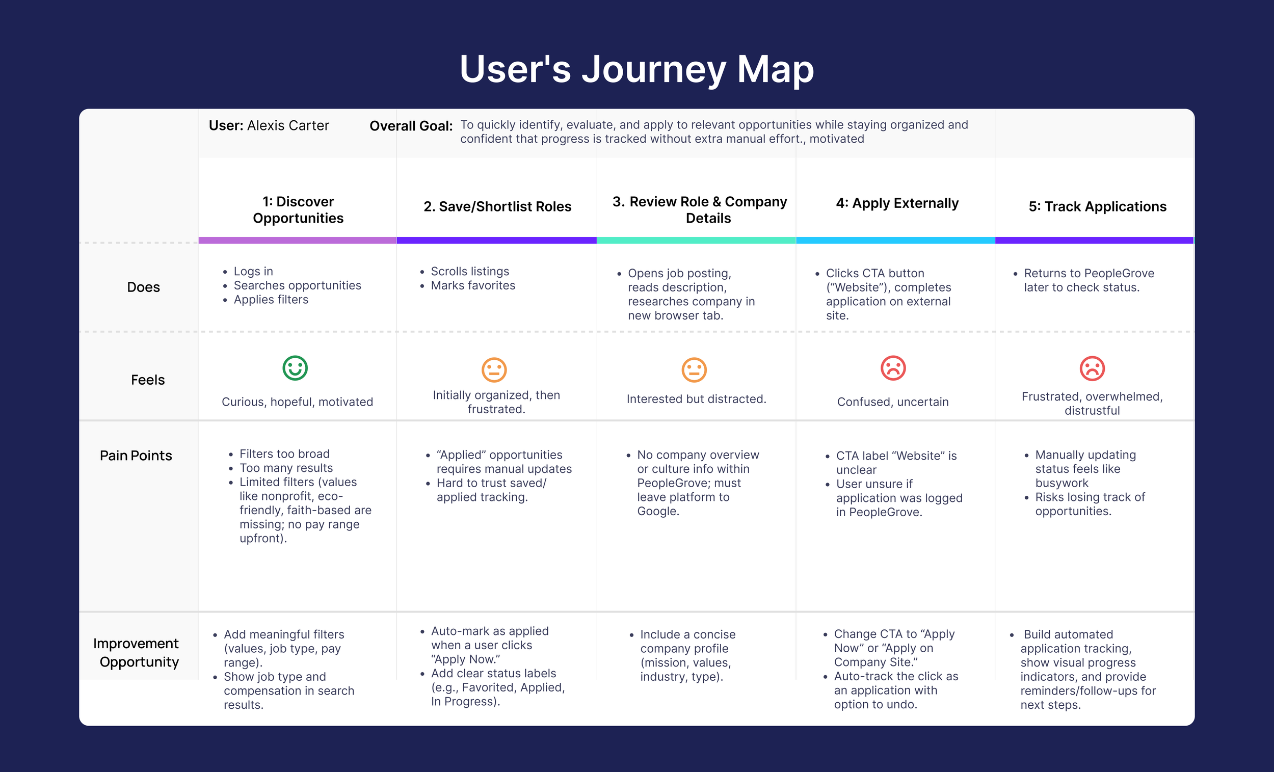 Building on the empathy map insights, I created a journey map to visualize Alexis’s experience from discovery to application tracking. The map highlighted key moments of frustration and opportunities for design improvement.