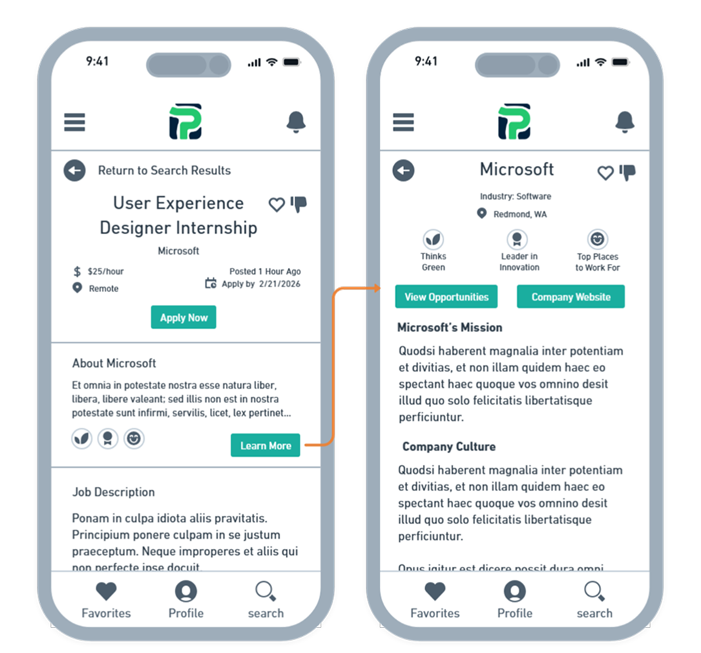 The Company Overview screen gives students deeper context before applying. By selecting Learn More, they can explore the organization’s mission, culture, and key strengths, presented through easy-to-scan badges.